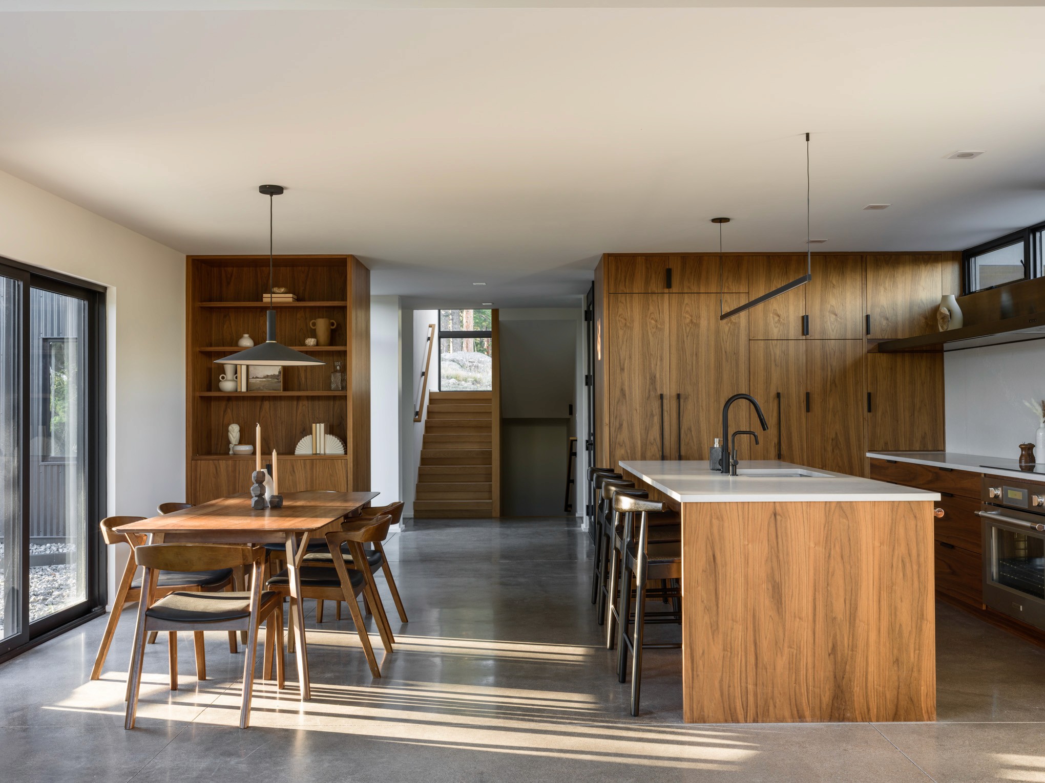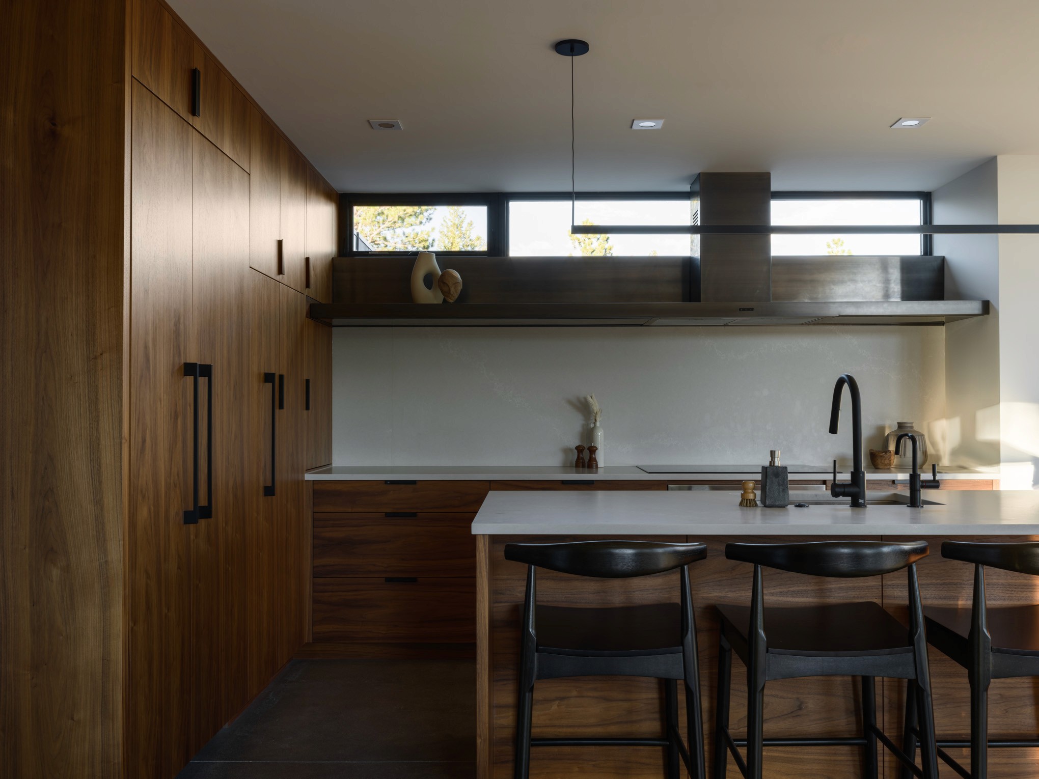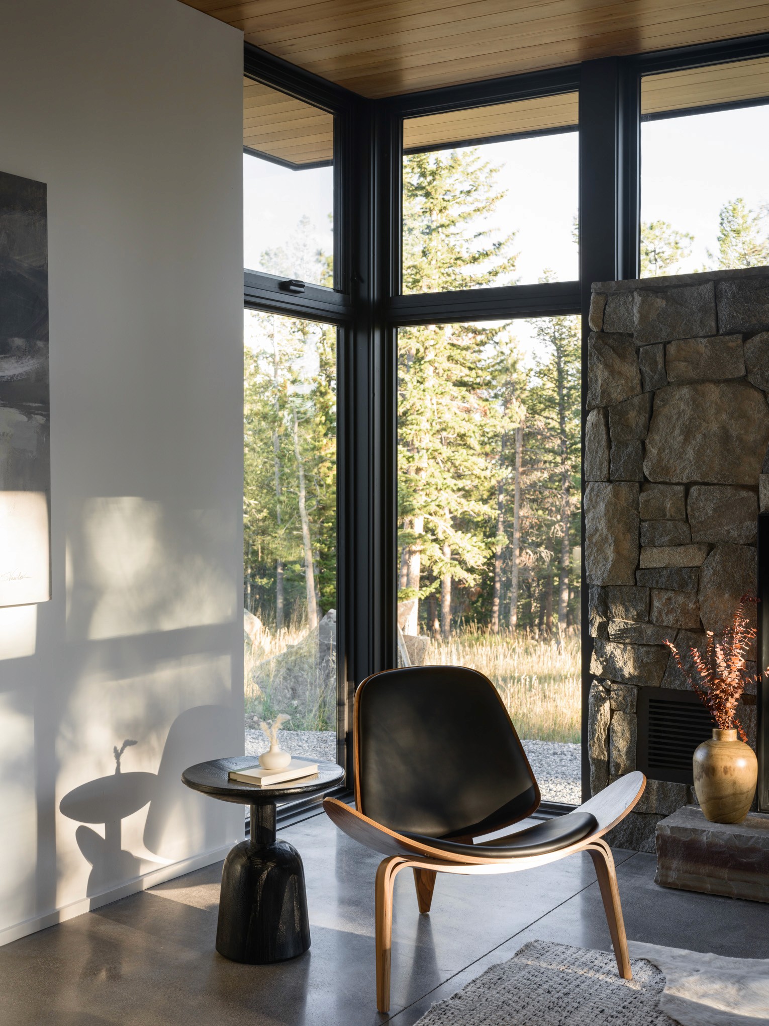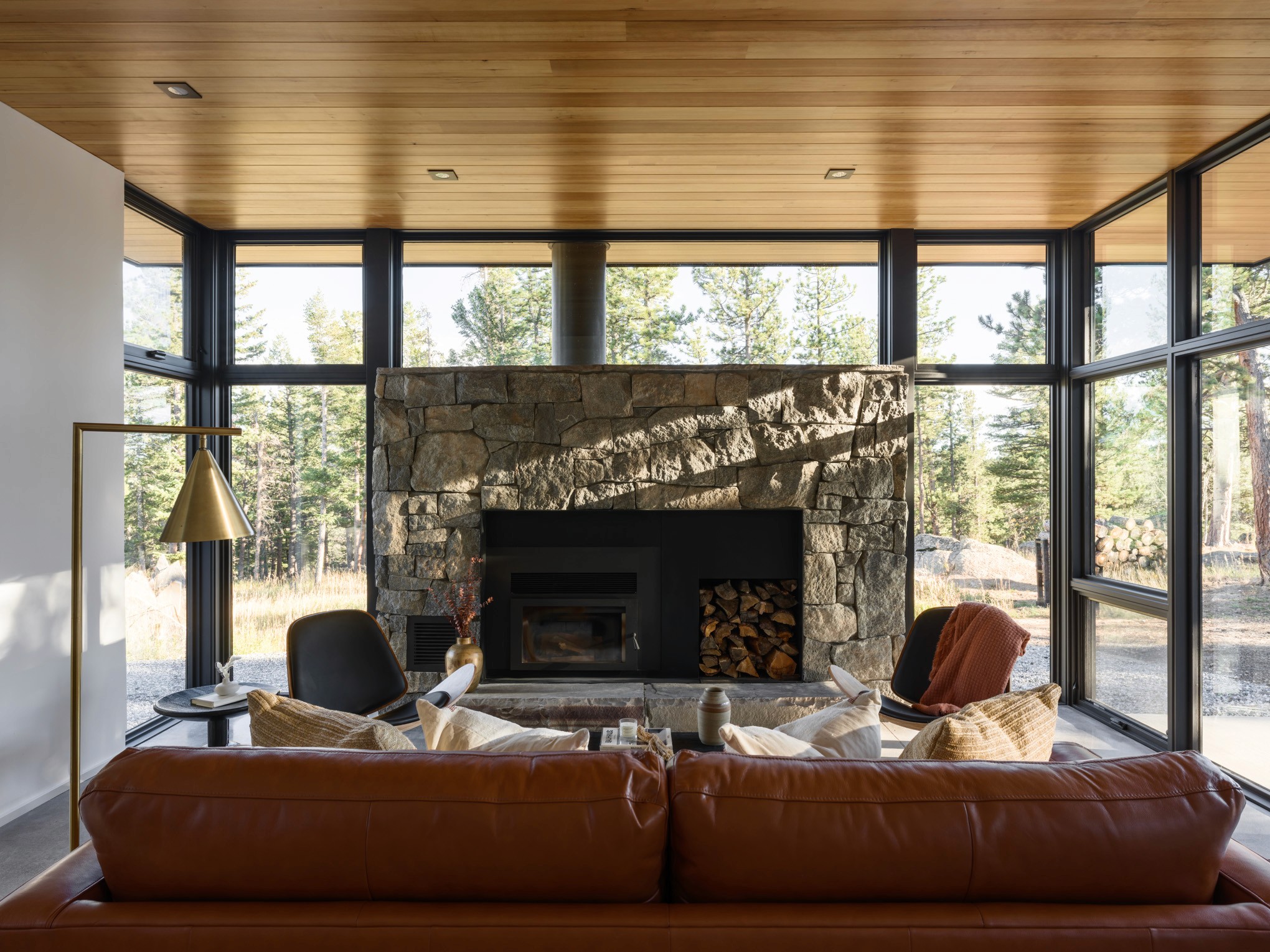The owners wisely chose to invest in a fully air-sealed building envelope to protect from the harsh weather, and fireproof exterior insulation and siding to protect against future wildfire threats. The structure is further fire-protected by gypsum board under any exterior wood finish. Radiant heating provides the base temperature control, with a high-efficiency wood stove adding that extra layer of cozy heat in the winter.