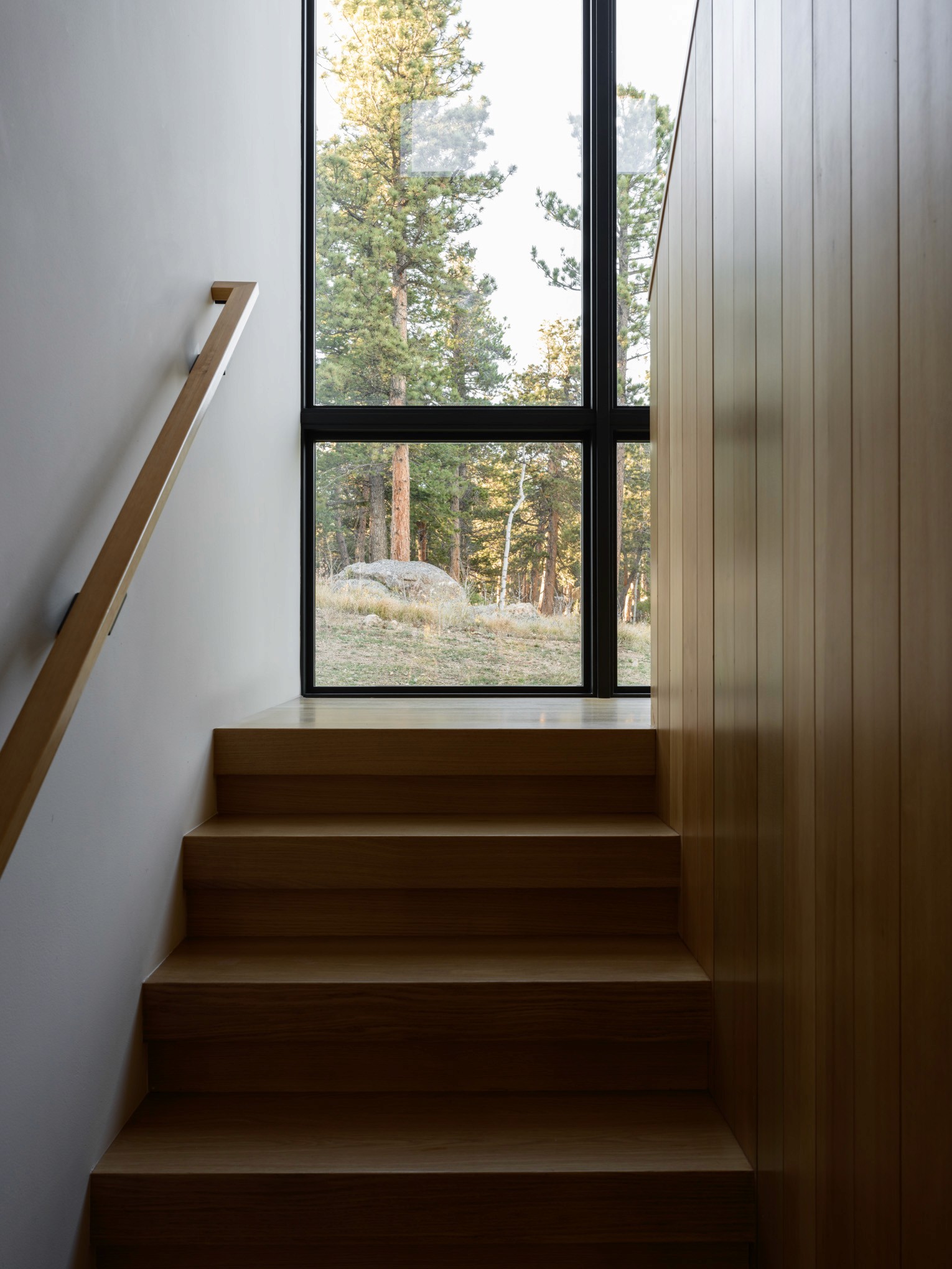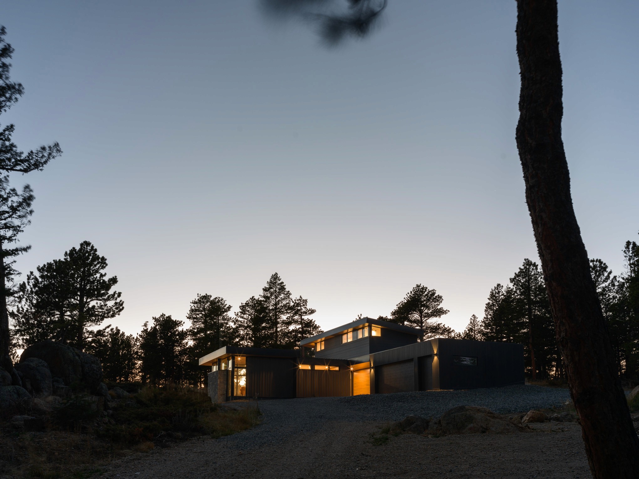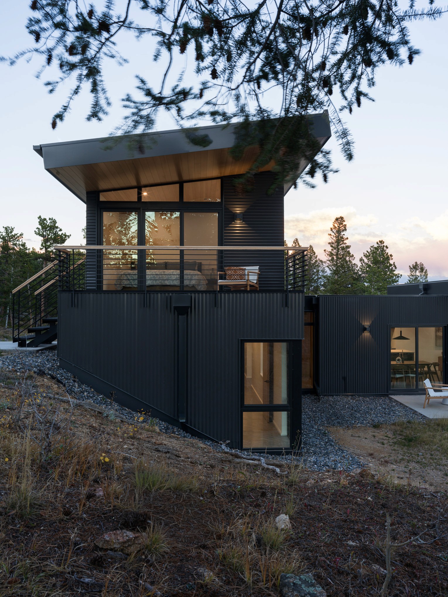 After spending time on the site together, we identified an area with a gently sloping hillside that the home could tuck into. With strong Westerly winds as our largest challenge to overcome, a 'T' shaped plan evolved, using a one-story portion as the main living area that would also block the entryway and driveway from the winter winds. The primary bedroom was placed on the second level, up the hillside for the best vantage point to views of the Indian Peaks beyond.