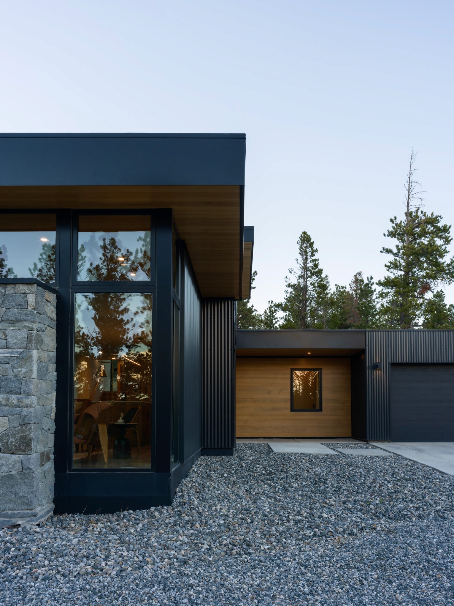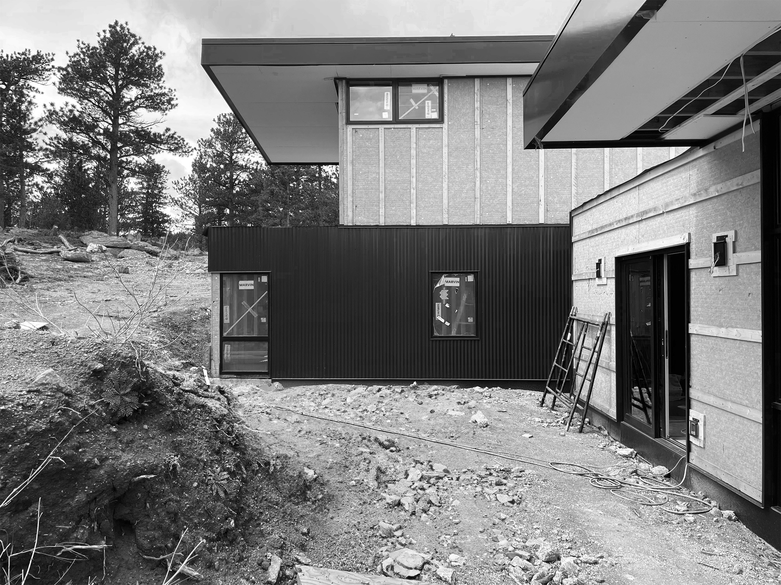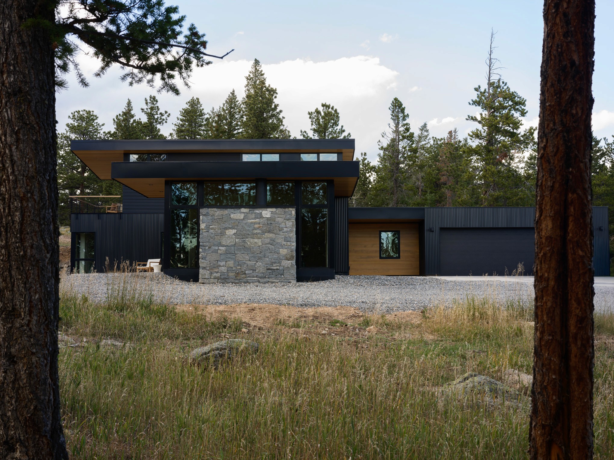After spending time on the site together, we identified an area with a gently sloping hillside that the home could tuck into. With strong Westerly winds as our largest challenge to overcome, a 'T' shaped plan evolved, using a one-story portion as the main living area that would also block the entryway and driveway from the winter winds. The primary bedroom was placed on the second level, up the hillside for the best vantage point to views of the Indian Peaks beyond.
